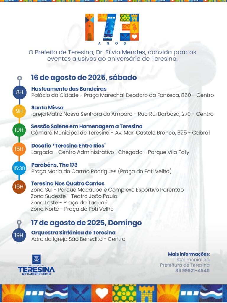 A Prefeitura de Teresina divulgou nesta terça-feira (12) a programação do aniversário de 173 da capital piauiense no próximo dia 16 de agosto. Em alusão à data, as atividades que acontecerão nos dias 16 e 17 de agosto. Dentro das celebrações religiosas e culturais, o evento contará com o tradicional hasteamento das bandeiras, missa em ação de graças, sessão solene na Câmara Municipal e o tradicional corte do bolo.
