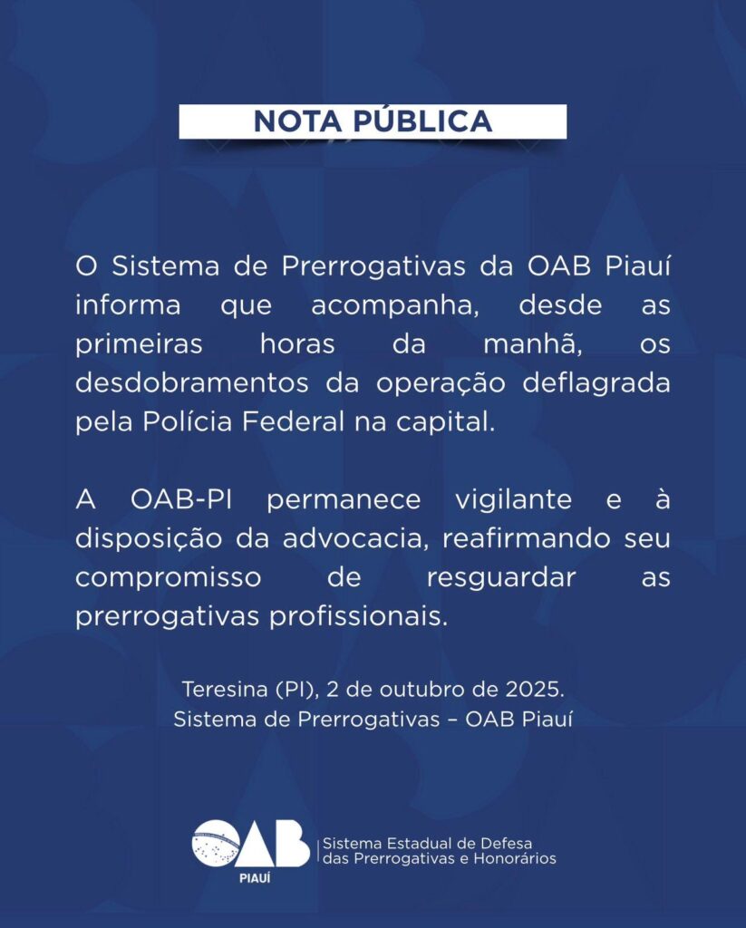 A Ordem dos Advogados do Brasil, secção Piauí, emitiu comunicado sobre os advogados que estão sendo investigados na operação da PF contra grilagem de terras.