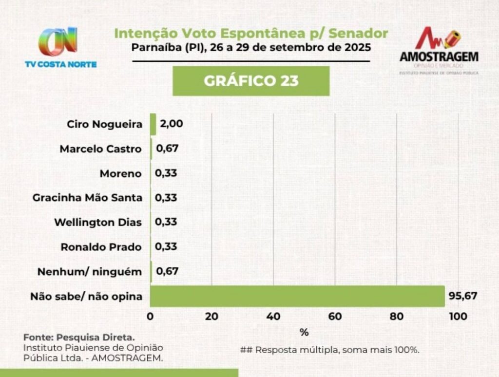 Se a eleição para uma das vagas para o Senado Federal, fosse hoje, o senador Ciro Nogueira (Progressistas) seria reeleito com 54% das intenções dos votos válidos. É o que aponta pesquisa realizada pelo Instituto Amostragem os dias 26 e 29 de setembro de 2025, em Parnaíba (PI), com 300 eleitores da cidade de Parnaíba, litoral do estado. O levantamento foi encomendado pela TV Costa Norte.