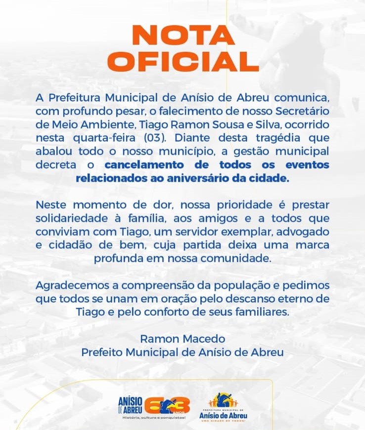 A Prefeitura de Anísio de Abreu, por meio da redes sociais, divulgou nota lamentando a  morte do secretário e cancelou as solenidades festivas referentes ao aniversário da cidade.