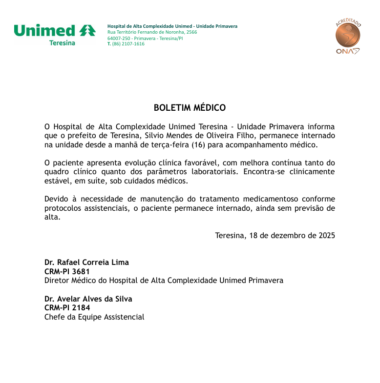 O prefeito de Teresina, Silvio Mendes, segue internado no hospital Unimed, localizado no bairro Primavera, na zona norte da capital, após apresentar sintomas de virose, incluindo febre.