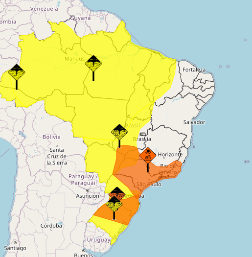 De acordo com o INMET, o aviso de tempestade, classificado como perigo potencial, prevê chuvas de 20 a 30 mm por hora, podendo chegar a 50 mm/dia, além de ventos entre 40 e 60 km/h e queda de granizo. O alerta teve início às 8h40 desta quinta-feira (25) e segue até as 10h desta sexta-feira (26).