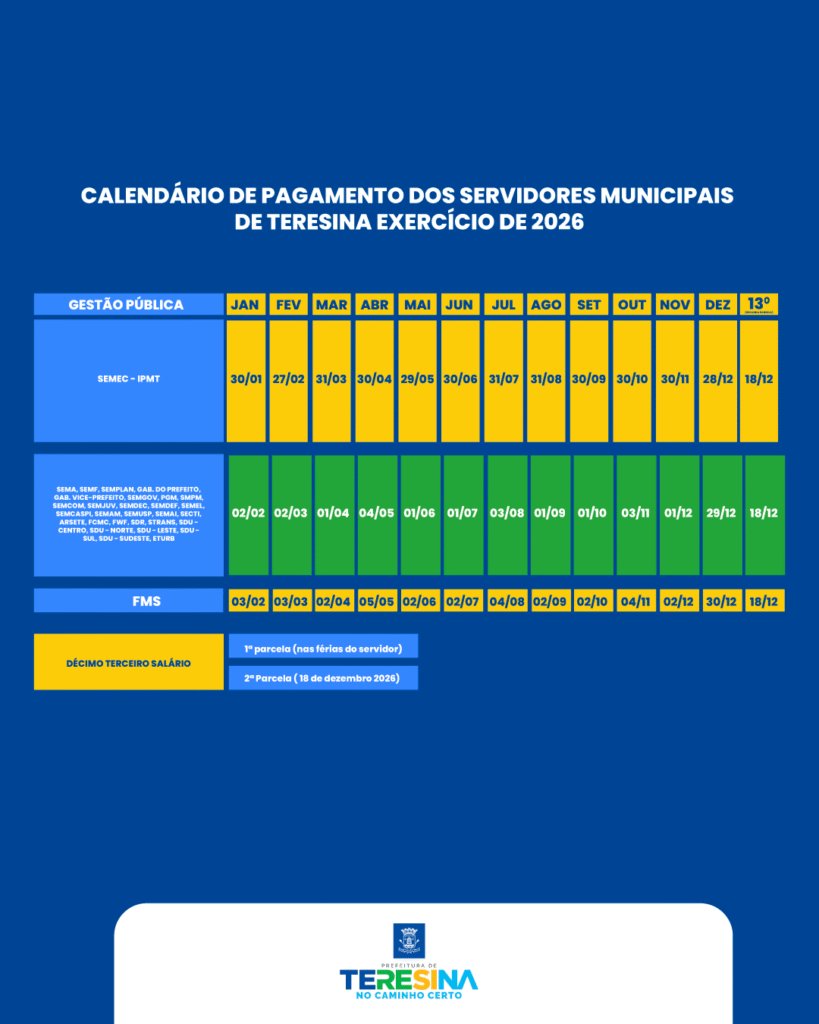 A Prefeitura de Teresina divulgou, nesta terça-feira (27), as datas de pagamento do salário dos servidores municipais referentes ao exercício de 2026. A divulgação traz segurança e transparência, garantindo que o servidor se organize financeiramente e saiba os dias em que receberá sua remuneração.