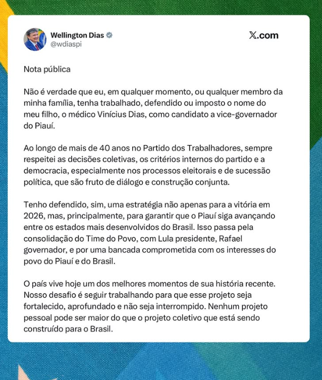 “Não é verdade que eu, em qualquer momento, ou qualquer membro da minha família, tenha trabalhado, defendido ou imposto o nome do meu filho, o médico Vinícius Dias, como candidato a vice-governador do Piauí”, destaca.